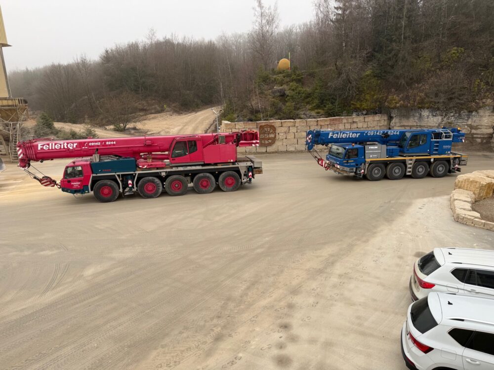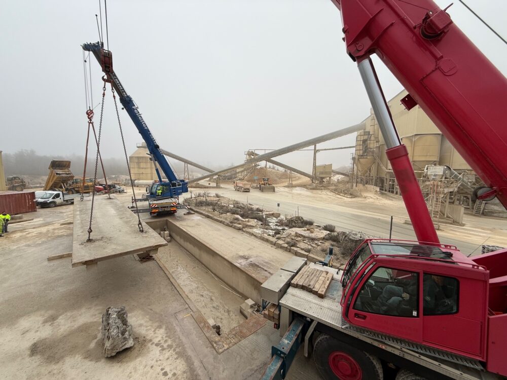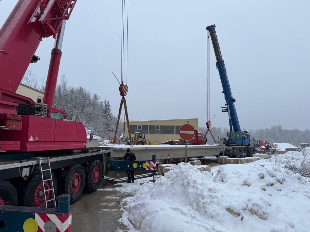 Mit zwei Kränen wurde die neue LKW-Waage millimetergenau an ihre Position gehoben und platziert. Teamarbeit, Erfahrung und exakte Planung waren hier entscheidend.